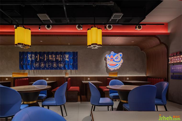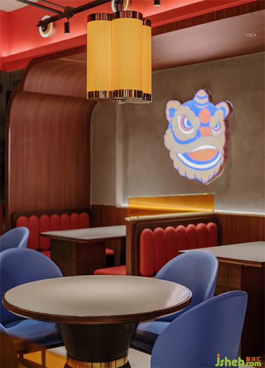 紅色,蘊含現(xiàn)代廣東人喜愛的大吉利是、興旺發(fā)財?shù)暮貌暑^。藍(lán)色,嶺南建筑鐘情的淺淡基調(diào)。二者相互映襯,餐廳設(shè)計以冷暖對比強烈卻不違和的茄紅色和翠藍(lán)色成為空間主色調(diào)。
