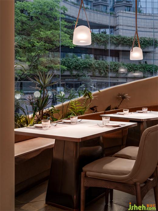 餐廳設(shè)計不規(guī)則的橢圓窗格如洞穴般,映照出外部世界若隱若現(xiàn)的天光,變成一道獨(dú)特的景致。暖色調(diào)石材、純粹豐厚的水泥、現(xiàn)代與未來感融合的金屬等多重材料交織碰撞。