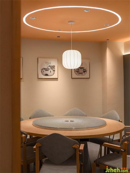 藤編主門、推拉式木隔門圍合起安靜的包間。餐廳設(shè)計(jì)仿牌匾形式標(biāo)語(yǔ)畫(huà)框“食在廣東,味在潮汕”和小幅方型科普畫(huà)懸掛于墻面,加之圓形發(fā)光燈帶、居于空間中心的圓桌,在方圓之間營(yíng)造暖心的景致和濃郁的相聚儀式感。