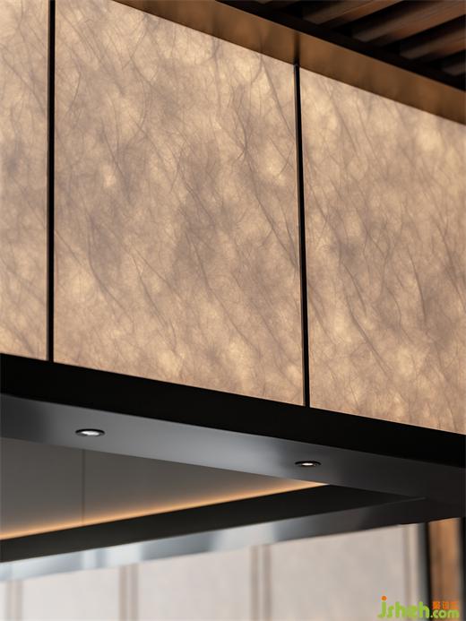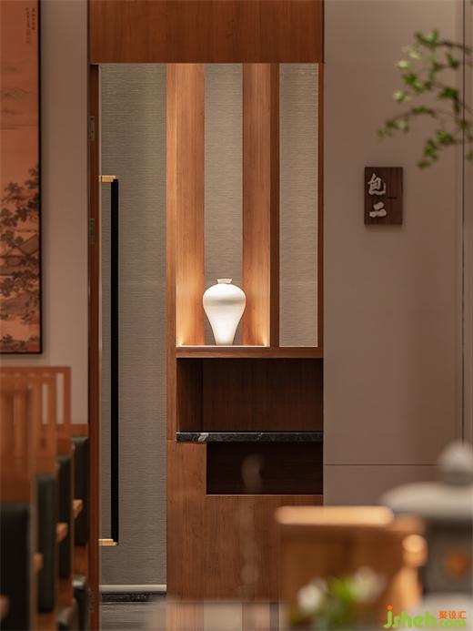 半包間以統(tǒng)一的組合序列構(gòu)建整體性,鐵板燒設(shè)計(jì)通過簡(jiǎn)單的半開放隔斷不僅建立起安全和包裹性,而且實(shí)現(xiàn)了隔間與大廳區(qū)域的內(nèi)外流通與互動(dòng)體驗(yàn)。狹長(zhǎng)的通道長(zhǎng)廊以留白的美學(xué)形式呈現(xiàn)象征繁榮市井生活的清明上河圖,走廊盡頭虛實(shí)光影、框景瓶器的靜態(tài)語言營(yíng)造出雅致的端景。