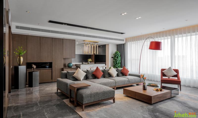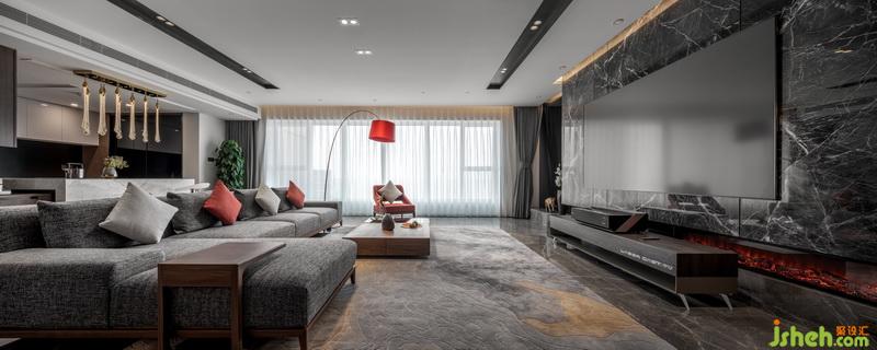 客廳區(qū)正對大海,夏天的海濱清新宜人陽光閃耀。因此室內(nèi)設(shè)計(jì)師在客廳選用基調(diào)為高級灰,云朵拉灰石材、意大利灰墻面與棕色影木、灰調(diào)布藝家具組合出涼爽、沉穩(wěn)的氣質(zhì),紅艷艷的壁爐與釣魚燈點(diǎn)綴出夭夭灼灼的華美。