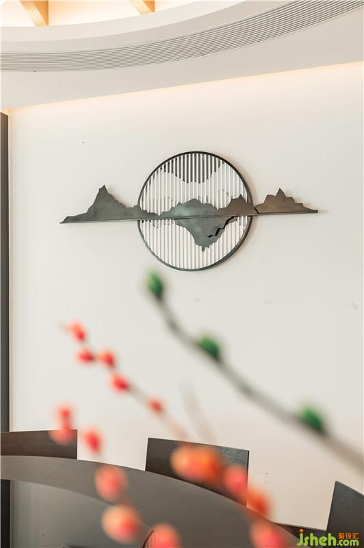 由上到下的圓圈仿佛手指輕點開寂靜的湖面,泛起的層層漣漪,而這漣漪無限的放大,也向放大處的遠方帶去了主人寬闊的襟懷??蛷d墻上的山水畫裝飾不就恰好表明了他寓山水之樂于胸間的情懷嗎?