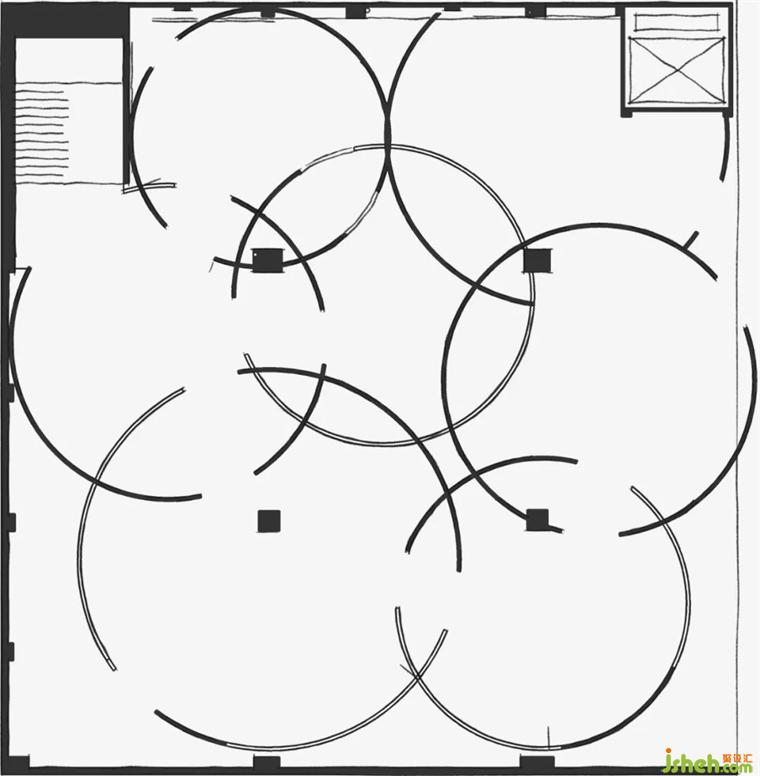 中國人對圓情有獨鐘,簡單的幾何圖案,寄寓圓滿而豐盛的理想,因此,設(shè)計師以圓形為基本元素置入到場所中,大小各異的弧形體塊交錯疊合,將600多平米的區(qū)域劃分為7個圓形的空間。人群漫步其中,空間的轉(zhuǎn)換觸發(fā)著人們感官的變化,視線越過窗洞、裂縫,既有“身在景中”的身臨其境之感,亦有“隔岸觀花”的雙重體驗。