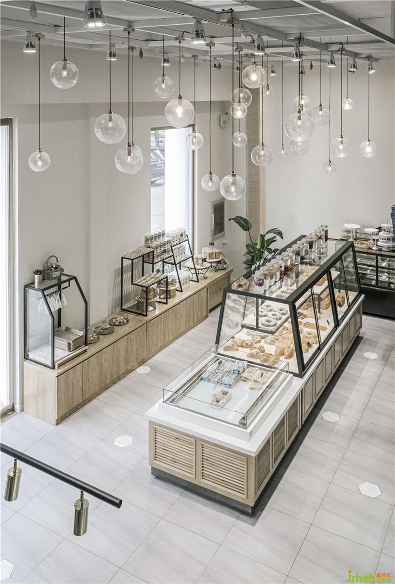 地板采用各種不同的拼接,形成視覺上的幾何美感。另外從吧臺(tái)區(qū)域整體看來,拼接的瓷磚像面包汁和果汁從吧臺(tái)流出濺落開來散落在每個(gè)角落,這也是一樓大廳的功能分區(qū)及消費(fèi)動(dòng)線引導(dǎo)。