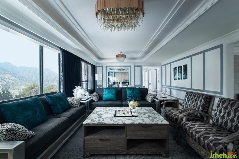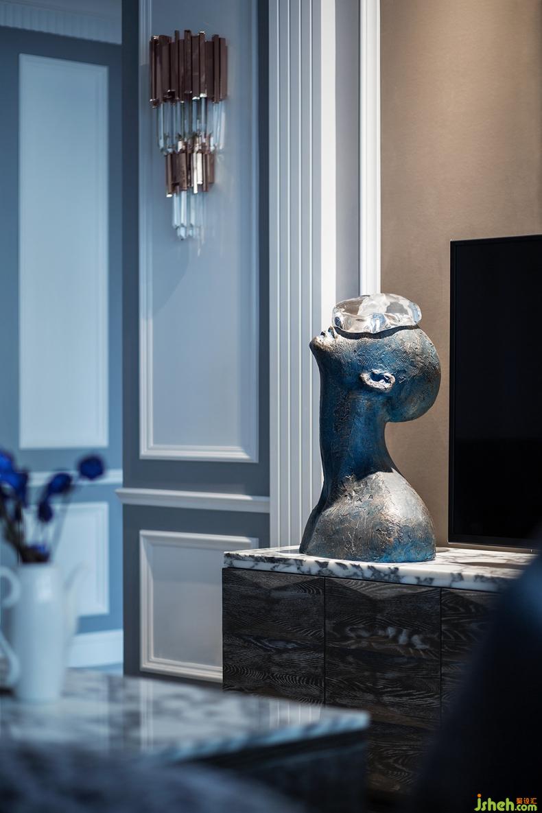 進(jìn)入客廳,宛如感受了現(xiàn)代與上世紀(jì)初巴黎藝術(shù)風(fēng)格在此邂逅。灰藍(lán)色與褐色構(gòu)成強(qiáng)烈的對比,通過水晶燈具的搭配,渲染上一層奢華情調(diào)。后現(xiàn)代風(fēng)格的壁畫、做工精巧的飾品、金屬線條的燈具,碰撞出極具韻律感的視覺沖擊,無不散發(fā)著奢華、雅致的空間氣質(zhì)。