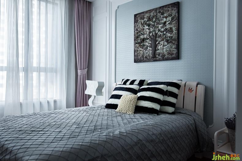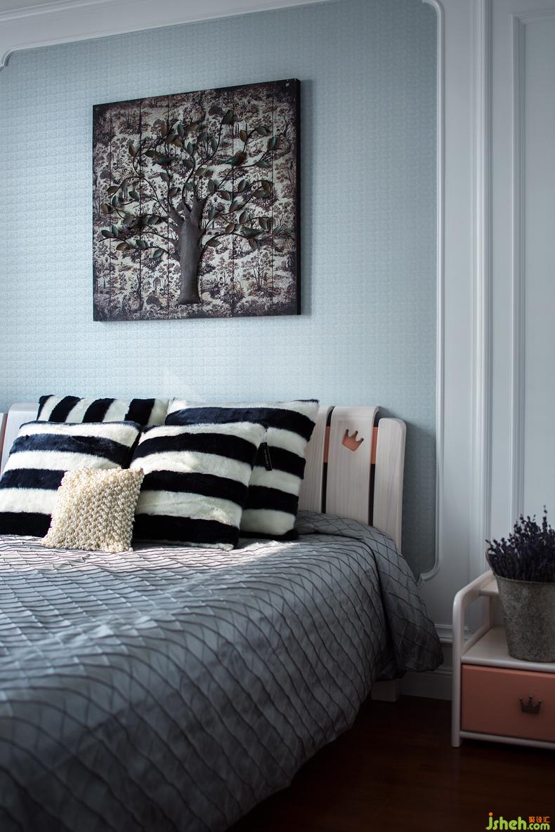 女孩房,設計師用個性相左的灰藍色與黑白條紋組合,碰撞中帶來超強的吸引力。