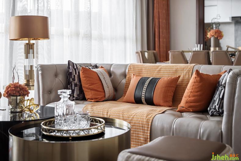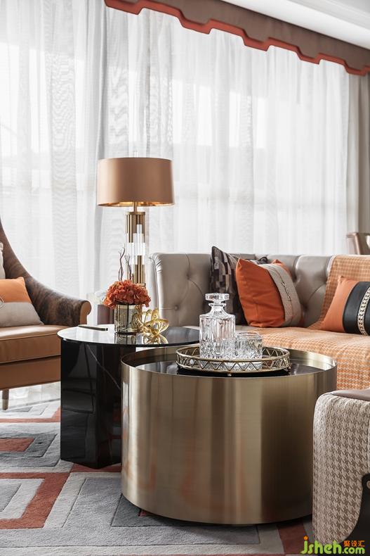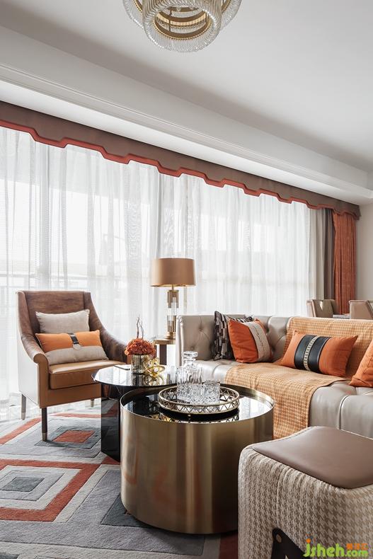 客廳重點突顯家具品質(zhì)在空間中的重要性,橙色的毛皮扶手椅是整個空間不安份的元素,造型舒展,仿佛向人發(fā)出邀請,落座瞬間,又有一種被溫暖環(huán)抱,擁有自己一片獨立私密的小天地的體驗??臻g以橙色為主色調(diào)開啟了“摩登”藝術(shù)之旅,由HERMES絲巾裝裱而成藝術(shù)掛畫流暢大氣,一抹橙色激活墻面的生活氣息,別致的家具也處處透著主人的身份與生活品質(zhì)。