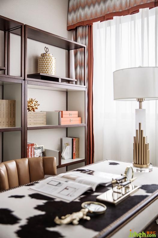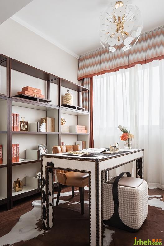 書房在細(xì)節(jié)處理上,書桌毛皮的大量運(yùn)用,高聳的書架,通過這些細(xì)微的表達(dá)傳遞出主人公的品味特質(zhì),他必定是享受學(xué)習(xí),有自己的愛好與追求。胡桃木色與奶白色調(diào)木飾面搭配的書架沉穩(wěn)內(nèi)斂,點(diǎn)綴些橙色與咖色,在靜謐中藏匿著奔騰而有活力的內(nèi)心。一盞蘑菇燈,不僅是功能上的滿足,也是業(yè)主對品質(zhì)生活的追求,結(jié)合經(jīng)典款家具為整個家增添了品質(zhì)感。