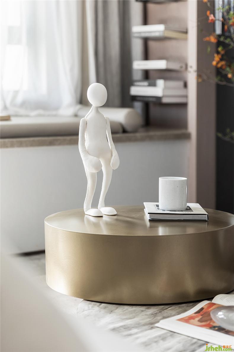 書本、畫冊,甚至愛不釋手的白瓷水杯、人形模具,在金色的臺面上更顯精致,樣板房設(shè)計看似隨性而松散的配置,給足了空間靈性和呼吸。