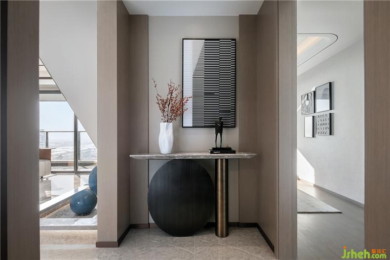 玄關(guān)臺(tái)上冷酷的人物雕塑,遺落了一顆金黃的赤熱之心,這種巧妙借鑒了“解構(gòu)主義”的手法,卻能從色彩到情感,冷與熱的強(qiáng)烈反差,形成了藝術(shù)的沖突之美,也像極了巴德·舒爾伯格在其文學(xué)作品中描述的“精彩極了”和“糟糕透了”的反差式的價(jià)值創(chuàng)造。