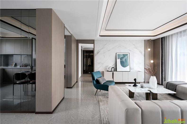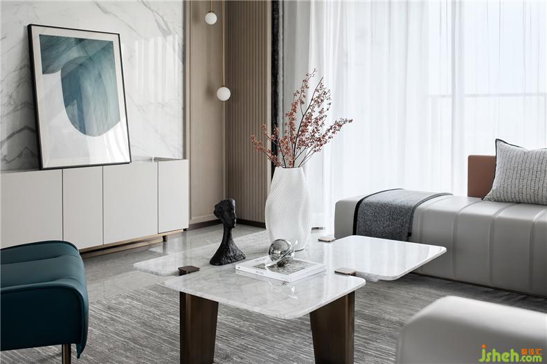 對(duì)于和諧的刻畫,沒有一個(gè)藝術(shù)創(chuàng)造者愿意拋棄“白色系”的,因?yàn)樗侨绱说难胖隆影宸吭O(shè)計(jì)干凈。以潤(rùn)白為韻,在造型上卻恣意變化,從不規(guī)則的茶幾上便可見一斑。
