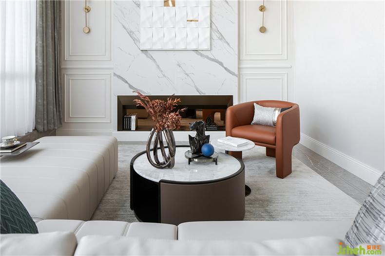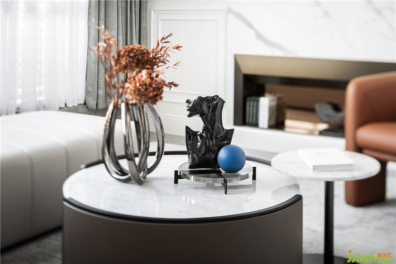 挑高的空間,自帶一種仰望的體量感,呈現(xiàn)了一種自由的精神狀態(tài)。樣板房設(shè)計(jì)沙發(fā)采用精致的灰白色皮料,點(diǎn)綴蒼青色的抱枕營(yíng)造出一種清雅氣質(zhì)。休閑椅的暗橙色綻開(kāi)了空間的時(shí)尚感,淺灰色的地毯、層疊的圓形茶幾,讓空間顯得豐富而有層次。