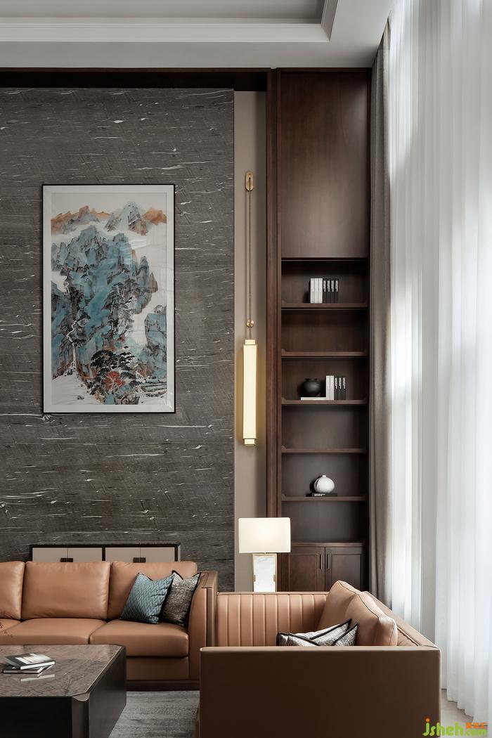 工整、利落的線條有著與生俱來(lái)的秩序感,圓形裝飾畫點(diǎn)綴其中,別墅裝飾營(yíng)造出幾何藝術(shù)感,粗曠的畫質(zhì)面帶著寫意的山水脈理,不經(jīng)意間傳達(dá)出東方大宅的意境之美。