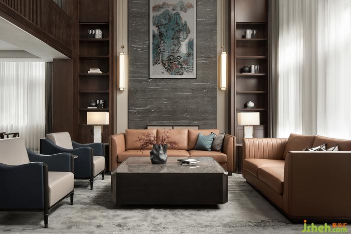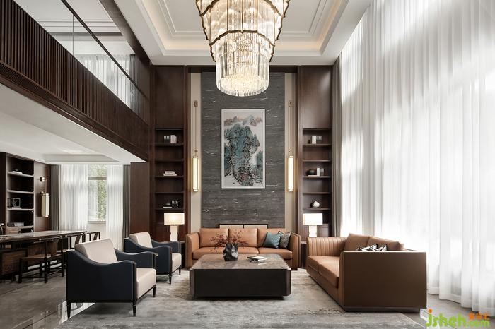 挑高的一層會(huì)客廳,大面積運(yùn)用深色的木飾面,讓整個(gè)空間透著一股淡淡的木香。天然大理石和兩側(cè)裝飾柜相得益彰,裝飾壁燈點(diǎn)綴其中,營(yíng)造出一派書香安靜的大宅氛圍。