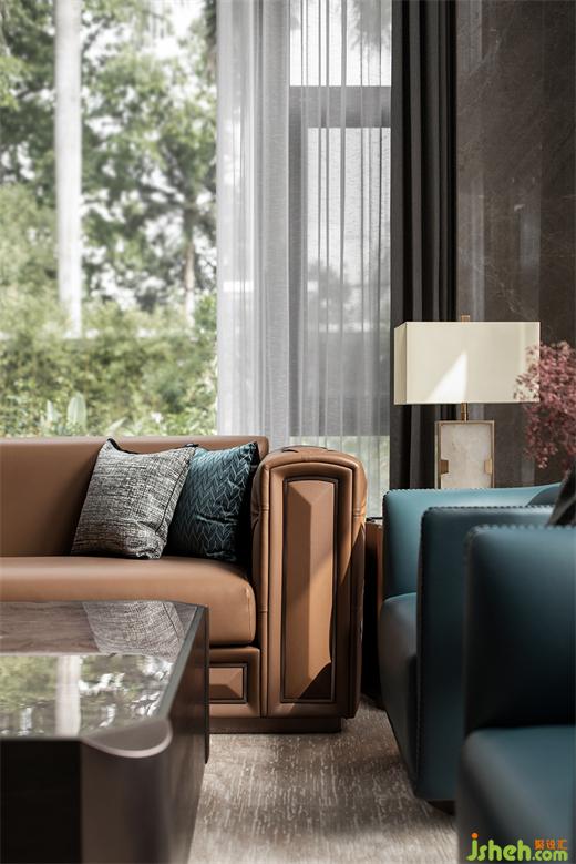 步入客廳區(qū)域,垂直挑空的立面,花園別墅裝修設(shè)計最大化重構(gòu)空間的開闊舒適,向上延展的落地窗,便可將外界的庭院景觀引入室內(nèi)。人、建筑、環(huán)境的界限隨之模糊。
