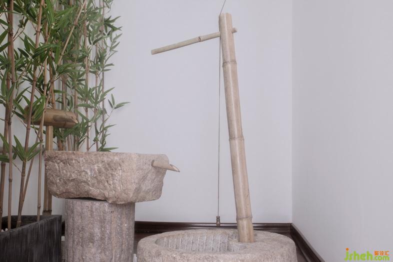 推門而入,家書簾首置眼底,枯山水造景置于兩側(cè),家書簾的端頭是傳統(tǒng)方形印章雕塑。采用中式借景的手法連貫中庭、客廳。品茶、論道、觀景,忘卻繁雜,僅存豁達(dá)。