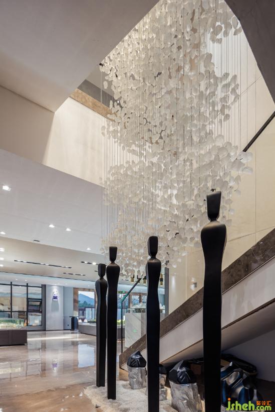 樓梯處以半透樹脂為元素,錯成山形與裝置藝術形成呼應,營造出靜謐,幻想之境。