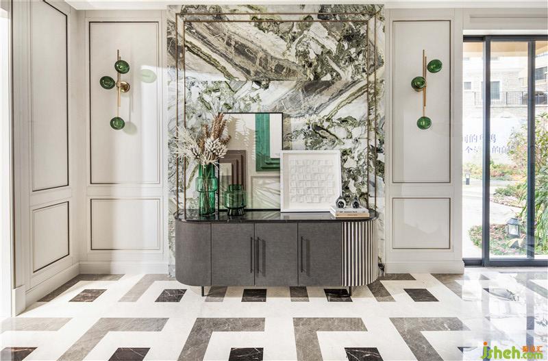高級而富有質(zhì)感的大理石紋作為背景,幾何立體裝飾畫搭配出豐富層次并且多樣的質(zhì)感。樣板房設(shè)計