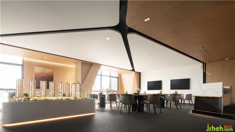洽談區(qū),意在去售樓處化,用當代藝術(shù)重新定義空間,打造專屬的都市會客廳。頂部獨特的設計減輕空間縱向厚重感,延伸效果由此產(chǎn)生。木質(zhì)所帶來的輕盈和流暢的線條隨處可見,到訪者逐光而行,感受設計的智慧。這便是我們給你最好的禮物。