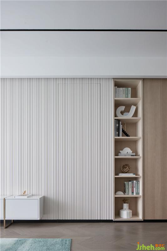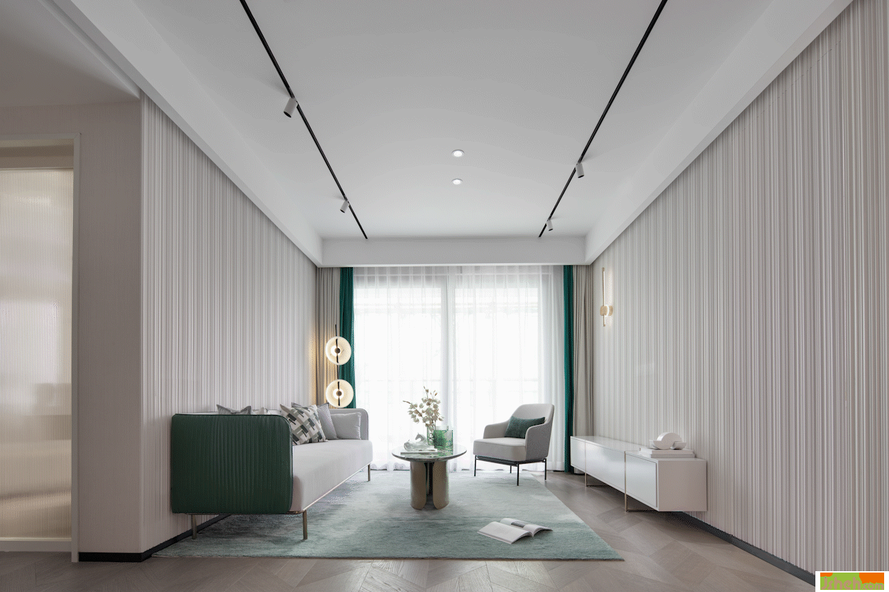 客餐廳最鮮明的痛點莫過于廚房的開門位置太過于接近客廳,樣板房設計為了保持空間整體的一致性,同時對各功能區(qū)作出劃分;
