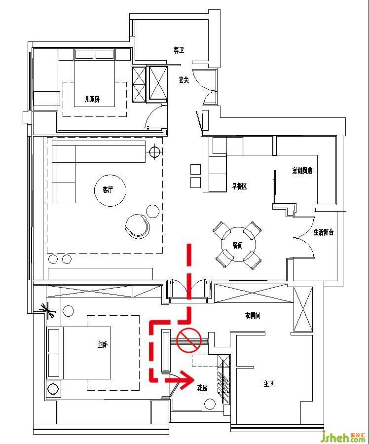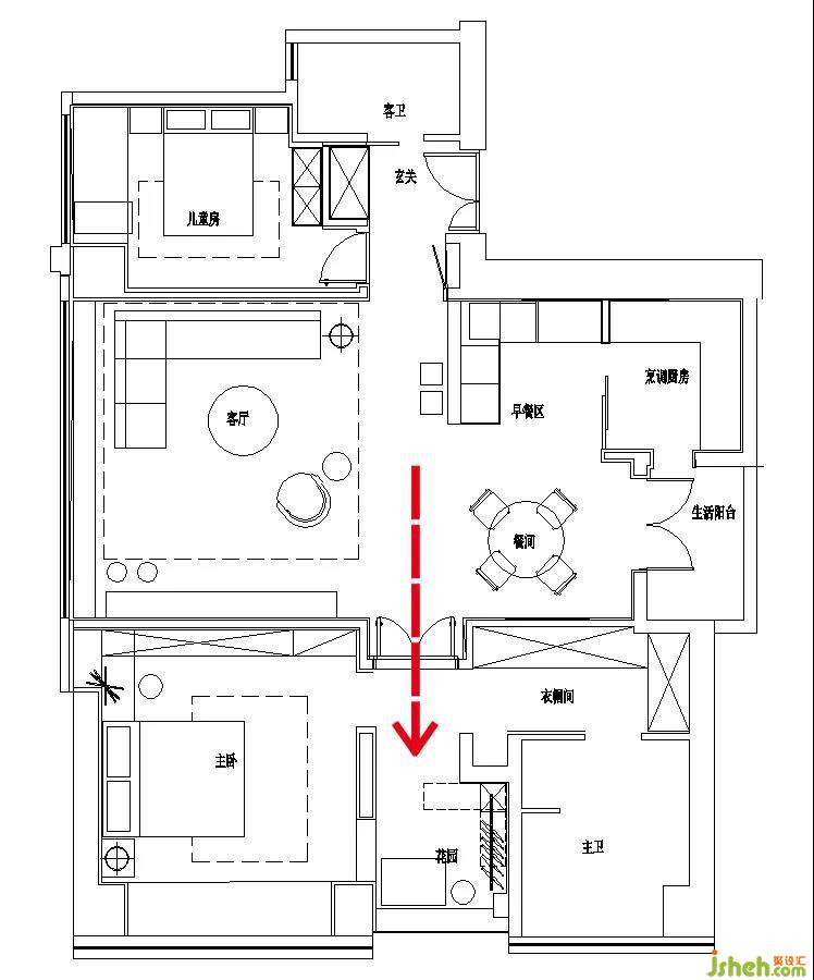 4. 主臥內(nèi)私密性較低,房主安全感。隨后依據(jù)以上問題進(jìn)行再規(guī)劃設(shè)計