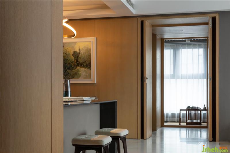 在入門處,從電梯廳走出,可發(fā)現(xiàn)鞋架與空間渾然一體,豪宅設(shè)計師特意地將鞋架抬高,便于房主進(jìn)出門脫換。人為地將鞋柜木飾面與墻面統(tǒng)一,簡雅而不失格調(diào)。