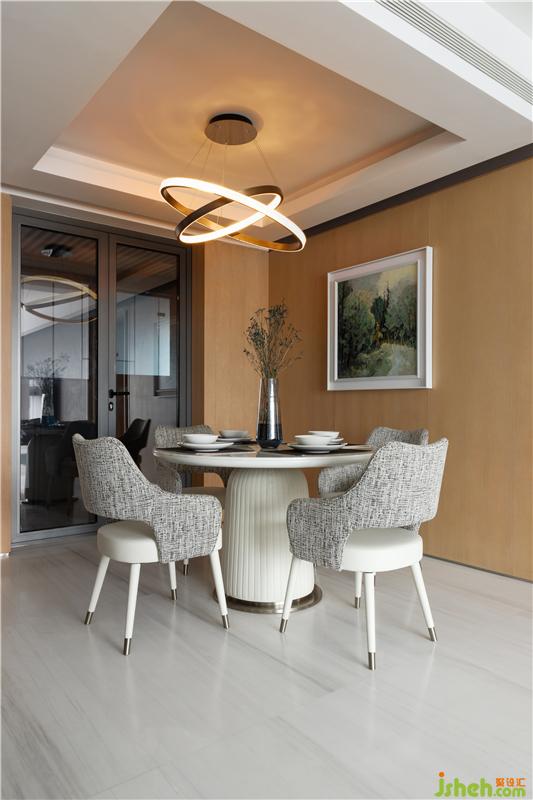 餐廳作為家庭情感交流的重要場地,減去了繁復(fù)的裝飾,天然木材和白色大理石圓臺桌營造出融洽舒適的生活意向。在就餐的同時也構(gòu)建起了人們的各種想象,提升了生活情調(diào)。