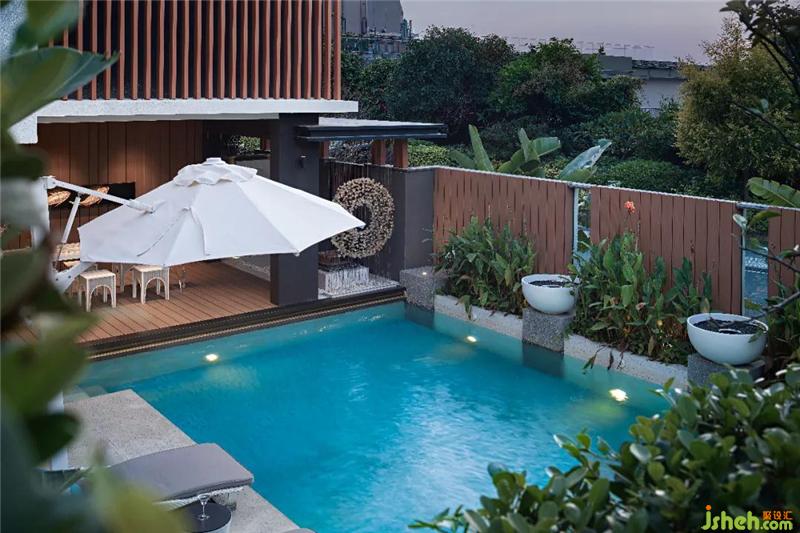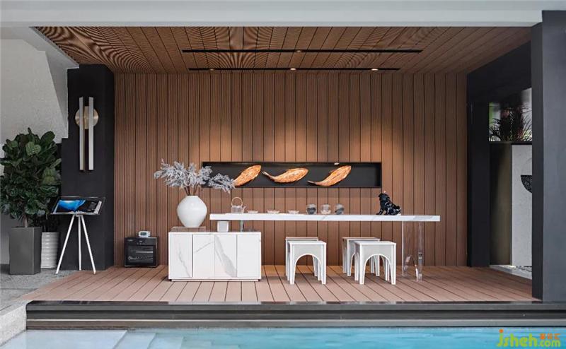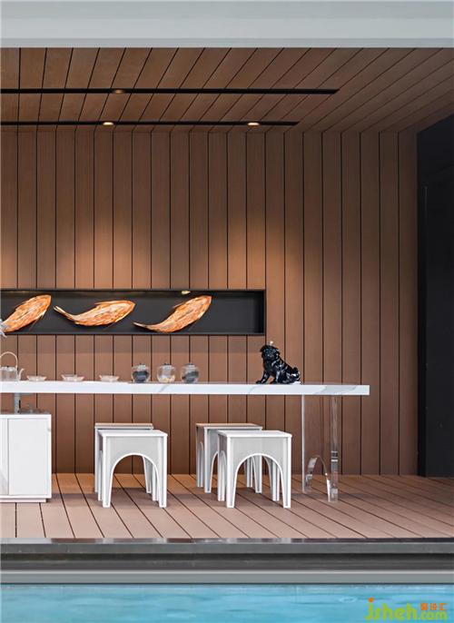中國(guó)禮序講究幾進(jìn)幾出,我們不希望所有人就像進(jìn)菜園門(mén)一樣隨隨便便就進(jìn)來(lái),而是要通過(guò)這樣的一個(gè)儀式感的狀態(tài),從側(cè)面來(lái)到我們主空間。我們還設(shè)計(jì)了一個(gè)很大的超尺度的這樣的一個(gè)泳池,不同于別墅型的泳池,我們把絕大多數(shù)空間留給泳池以及可以做派對(duì)、餐飲的地方。原本大的尺度減小了,小的尺度放大了,打造出別樣的生活方式。這是比較大的驚喜。