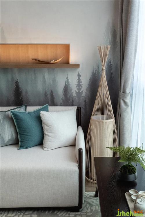臥室的背景墻采用淡黃色的藤編織物,與清雅的綠色調床品形成對比,不論是色調還是織物都不約而同營造出了舒適慵懶的氛圍感。