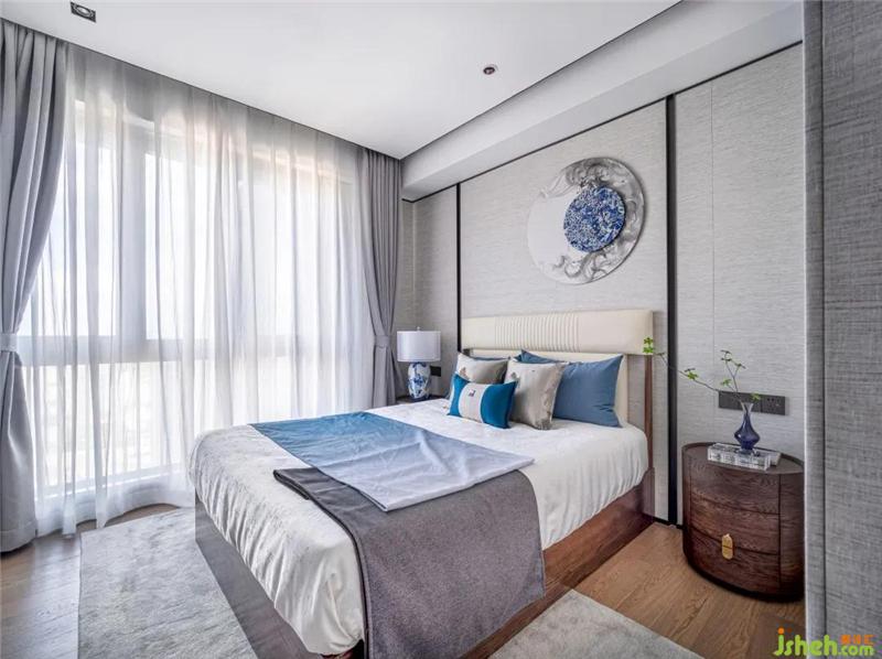 主臥則采用淡雅的色調(diào)來打造,簡約的設(shè)計,床頭素色清雅的青花瓷裝飾畫樣板房設(shè)計。碎片的拼貼,寓意歲歲平安,釉面肥厚、滋潤,釉色泛青,青韻之美 代表一種愛的琢美。