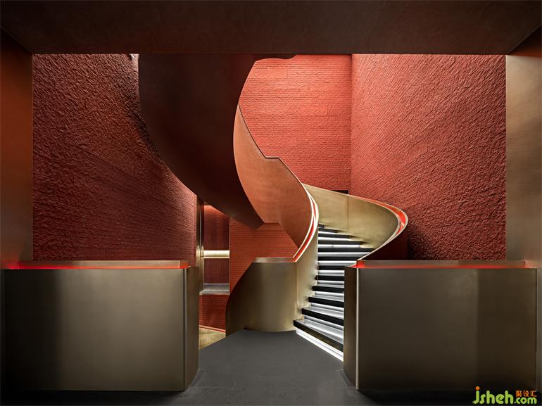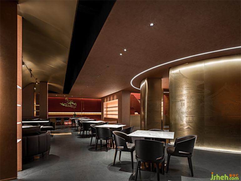 知嘛健康成都春熙路店餐廳設(shè)計(jì)位于空間二層。藝術(shù)涂料色調(diào)壓暗,自然形成的斑駁肌理在迷離光影下浮動(dòng),時(shí)間的灰塵灑成一層磨砂質(zhì)感的金,富于重量的黃銅拉出輕盈流動(dòng)的弧,在垂直空間創(chuàng)造出層疊變幻的視覺底色。