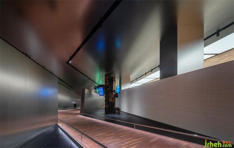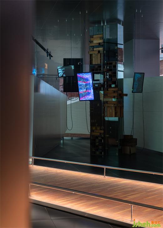 黑色鏡面與不銹鋼天花打造出空靈質(zhì)感,使人沉浸其中,恍若進入另一番探險。參觀大廳設(shè)計疊錯的折線、轉(zhuǎn)換的視角在多維線性空間展開。數(shù)字化生產(chǎn)工藝實景和智能化顯屏櫥窗二次折射元宇宙的光影,輝映著綿延在時空中的品牌精神。