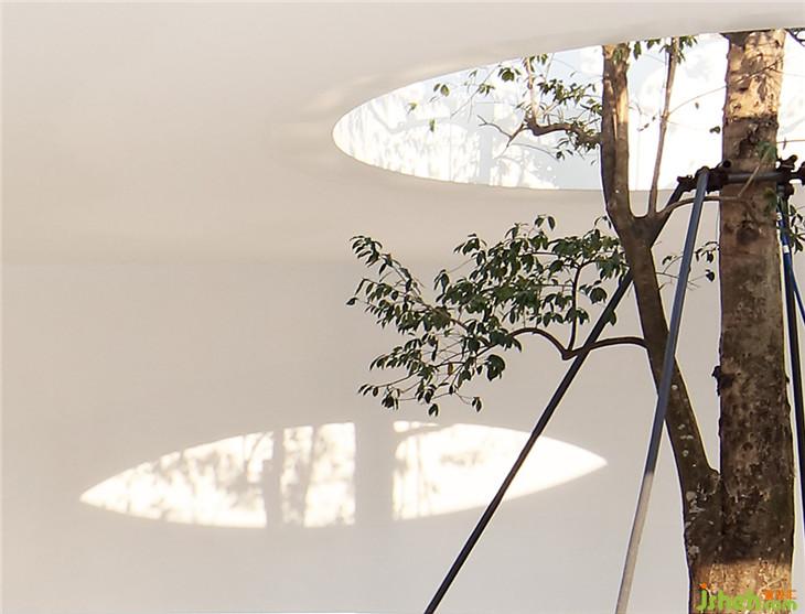 陽光透過屋頂圓型天窗照射到樹梢,