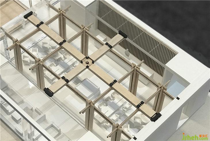 擅長(zhǎng)“容納”、“延展”的榫卯結(jié)構(gòu),以遞進(jìn)的表現(xiàn)形式表達(dá)著純粹的悠遠(yuǎn)和自然;虛實(shí)重復(fù)的木格柵巧妙地模擬了東方山水藏露的含蓄。利用木材的不同形態(tài),強(qiáng)調(diào)線與面所形成的空間變化,極簡(jiǎn)主義的品質(zhì)感和詩(shī)意從旁烘托,勾勒出一處依山傍水的寫(xiě)意地。