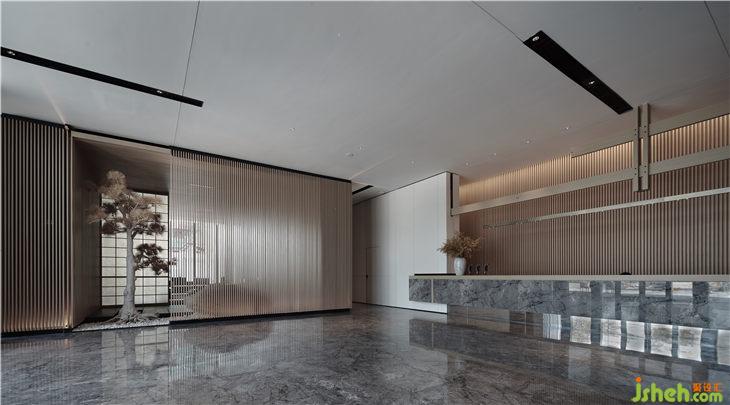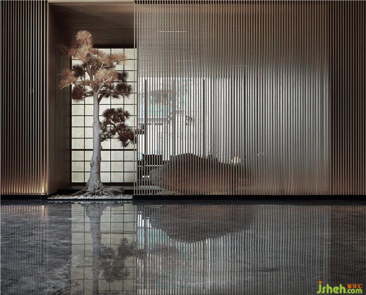 落于接待大堂左側(cè)的VIP休憩區(qū)的木柵格韻律舒緩寧?kù)o,凈白的枯樹(shù)與細(xì)細(xì)分割的光影掩映成趣。舉步入內(nèi),一方看得見(jiàn)遠(yuǎn)處風(fēng)景的空間。窗外的自然景觀和室內(nèi)的日式枯山水,似乎就在這個(gè)“小木盒”中喁喁對(duì)話。