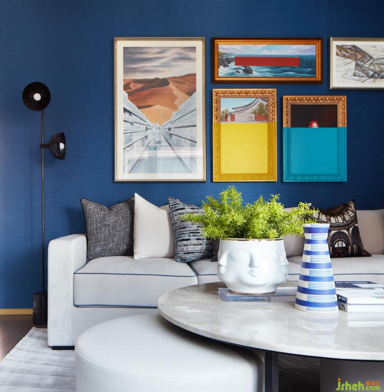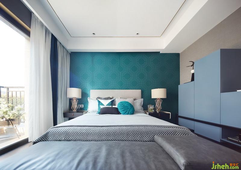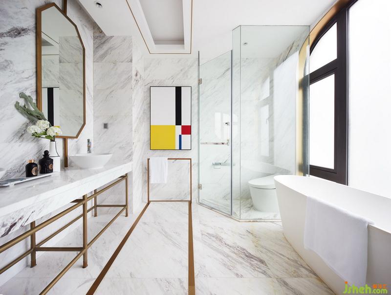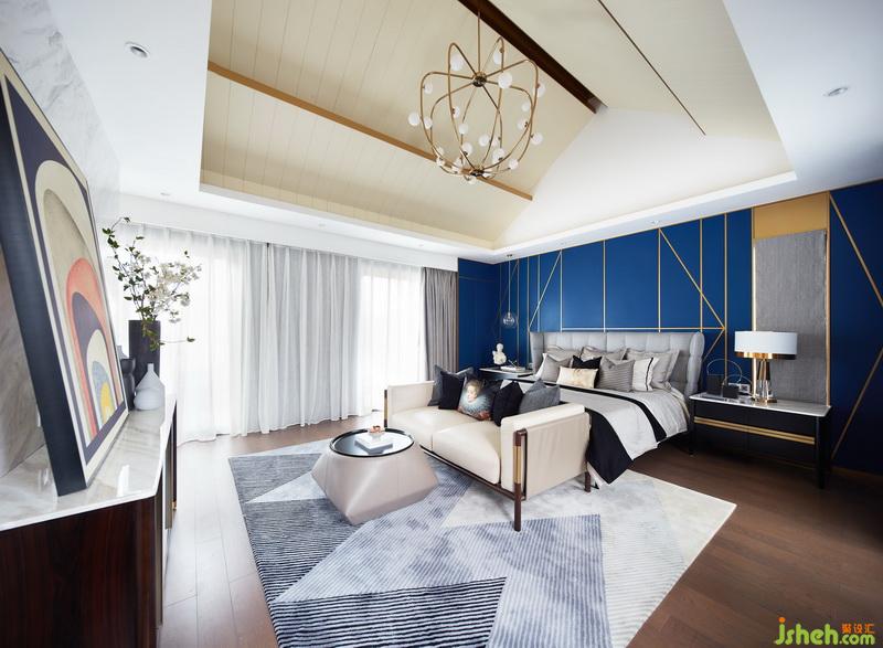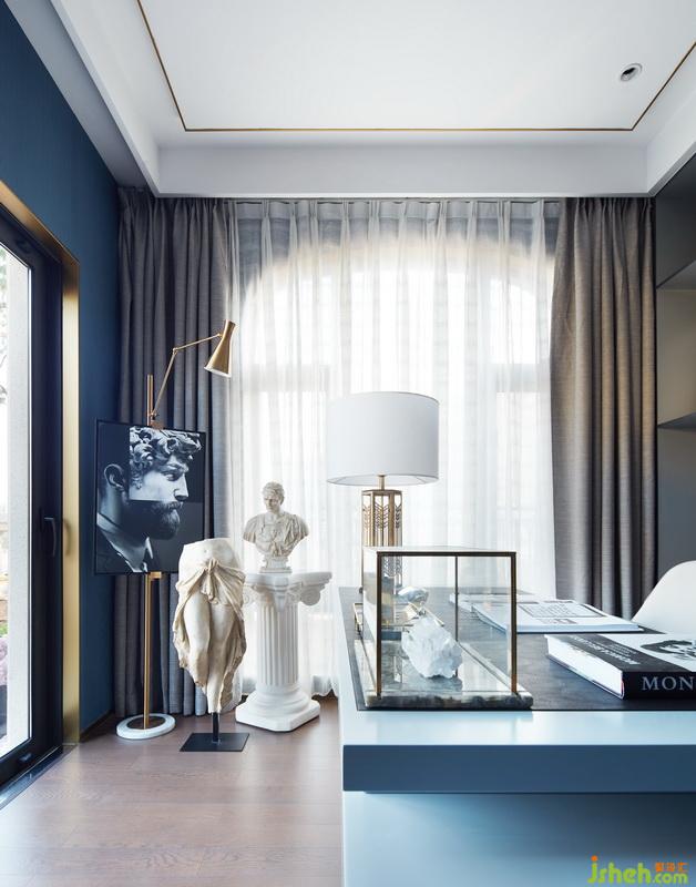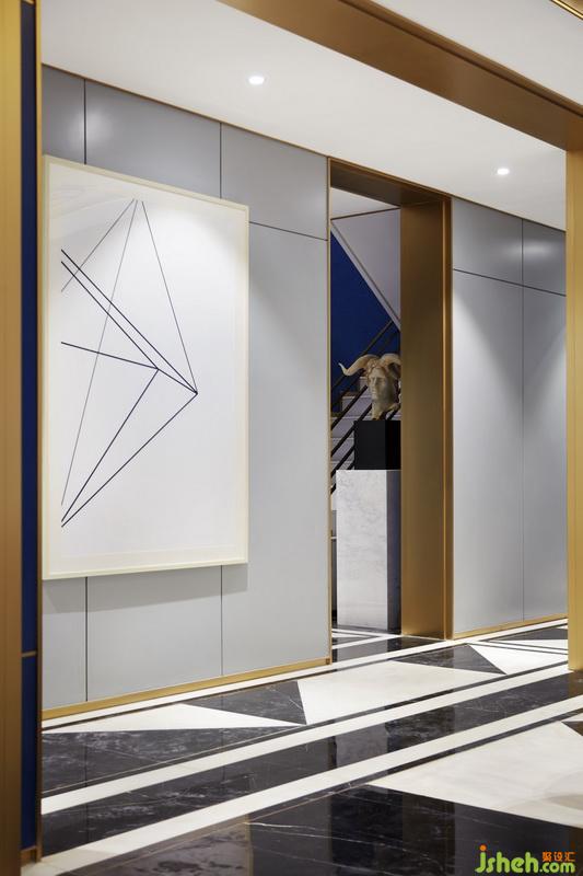其他起居空間中,以舒緩、通透和柔和為原則,設(shè)計師所采用的藍(lán)色和綠色各有層次,利用不同的織物搭配出不同的氣質(zhì)。一條條金色折線穿行其中,如同一個引索,串聯(lián)起不同有關(guān)生活、藝術(shù)的夢幻。