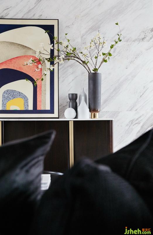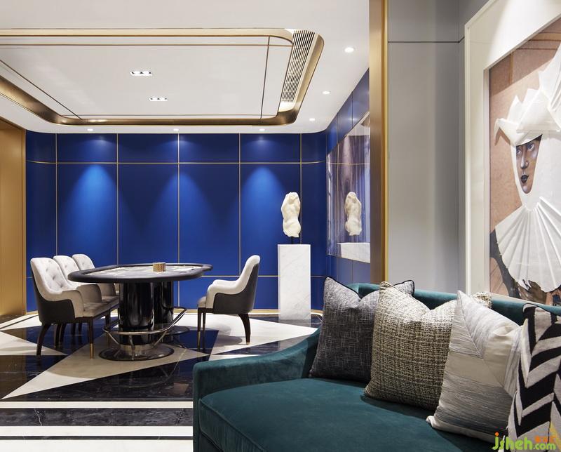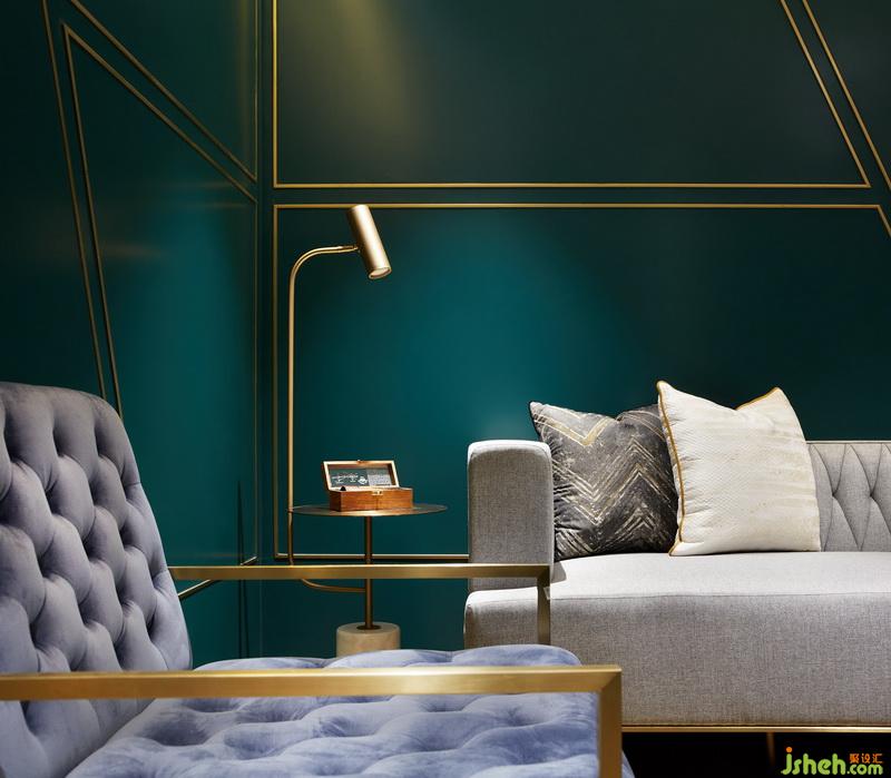 主題定義為了不起的蓋茨比,在電影海報中呈現(xiàn)ArtDeco(藝術(shù)裝飾)的符號,整個空間的室內(nèi)設(shè)計的靈感源于對ArtDeco的崇高致敬,也在強調(diào)著對藝術(shù)敬意和熱愛。因此除了在空間設(shè)計發(fā)揮容納、展示、使用方便的優(yōu)勢,也著重在陳列上的藝術(shù)性。如客廳中的沙發(fā)我們也采用了時尚頂級意大利品牌Baxter,其以生產(chǎn)如藝術(shù)品般值得擁有和收藏的家具產(chǎn)品而著稱。長款沙發(fā)名為Cherster Moon擁有特別調(diào)製深藍色,顯得高貴優(yōu)雅,提升整個客廳的氣質(zhì)。