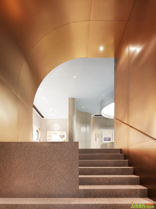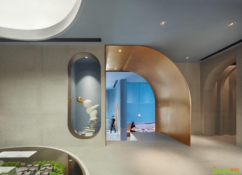 通往樣板間的藝術走廊也充滿巧思。半圓互相疊合,利用錯覺的效果形成一個個陣列式排布的拱門,打造又一個優(yōu)雅的符號。藏燈的設計使光纖柔和均勻,讓人置身其中,宛如走入一條神圣的走廊,穿越到遠方。