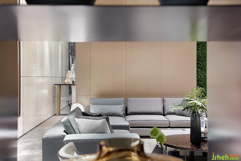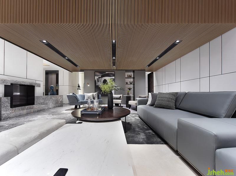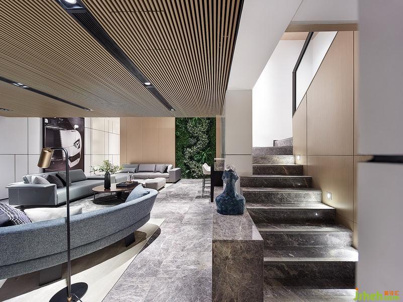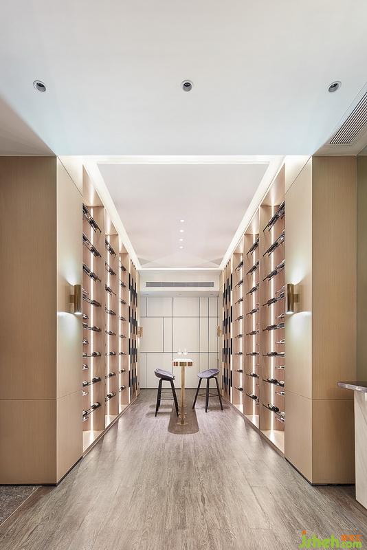 地下二層的聚會(huì)大廳,更多用以接待親友,呈圍合式的MINOTTI組合家具,可根據(jù)聚會(huì)的形式和人數(shù)有機(jī)組合??臻g中大理石地面鋪裝延伸到品酒吧臺(tái),白色塊面墻身和木飾質(zhì)感構(gòu)成新的視覺體驗(yàn)。