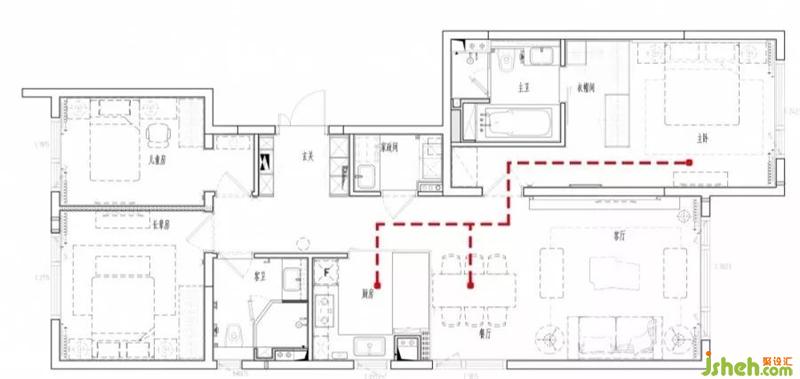 考慮到主人會因工作早出晚歸,有可能影響其他家庭成員的休息,設(shè)計上為家庭成員劃分動靜分區(qū),活動區(qū)域和生活區(qū)域互不干擾,減少噪音對其他家人的影響。