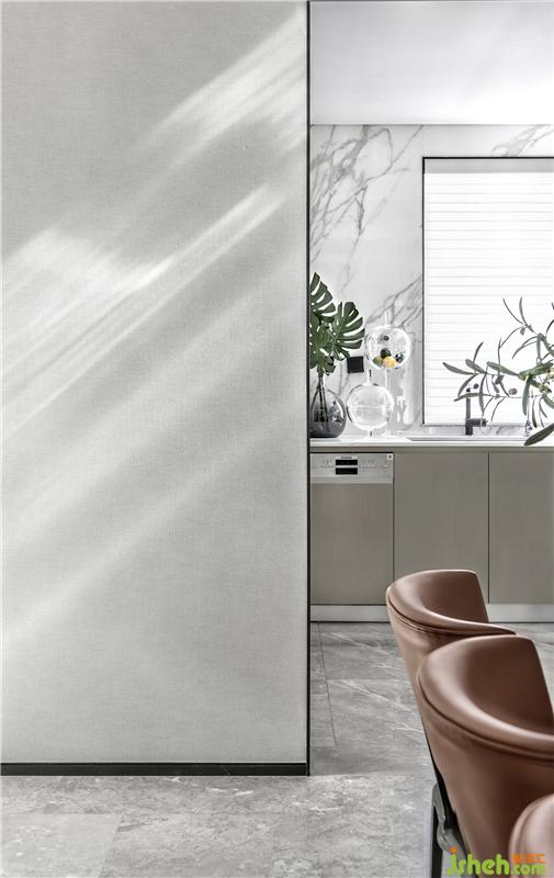 空間最顯著的特征,即是主臥-餐廚空間的動線相當(dāng)流暢、直接,十分便捷,節(jié)省大量的時間,不但讓主人可以多睡30分鐘養(yǎng)精蓄銳,也能輕松實現(xiàn)一頓簡便的早餐,為男女主人奉上早上難得的二人親密時光。樣板房設(shè)計