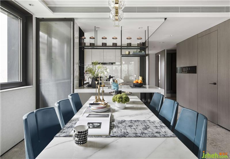 135戶型的餐廚空間采用了開放可變式結構。廚房雖然了綜合中廚和西廚,卻巧妙地化解了兩者一體時容易出現的兼容問題。入廚位置添加了一扇推拉門,準備中餐時將其閉合,可最大程度地減少油煙外溢。而大理石中島吧臺的一側則朝餐廳開放,掛架和墻體充分收納,為家庭活動提供樂趣多多的場地。