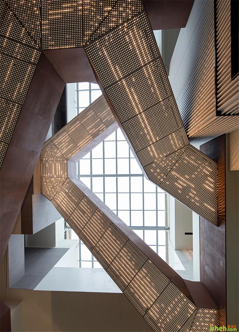 設(shè)計師本著為營銷定制空間體驗的出發(fā)點,設(shè)計了主要銷售動線和二次銷售動線,并將洽談區(qū)以及招商洽談區(qū)分布在不同的樓層間,以增加私密感。 云梯以回旋式的結(jié)構(gòu)迂回上升,燈光透過云梯金屬板上的孔隙映射,明暗交錯的視覺模糊,影影綽綽間可見現(xiàn)代解構(gòu)主義的曲線感。金屬質(zhì)感的兔子模型置于云梯下方,在金屬感中邂逅一種虛實相生的趣味性。