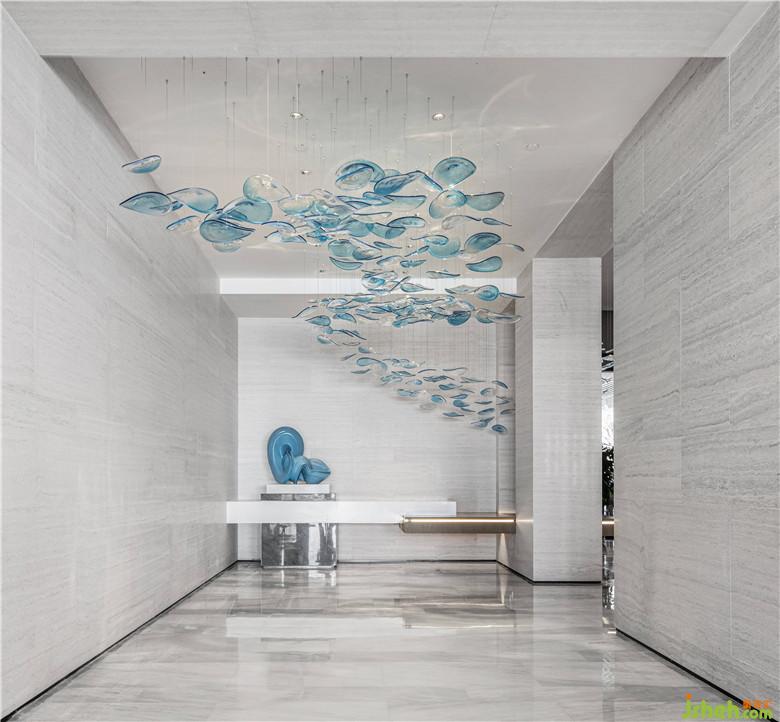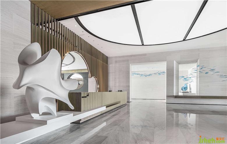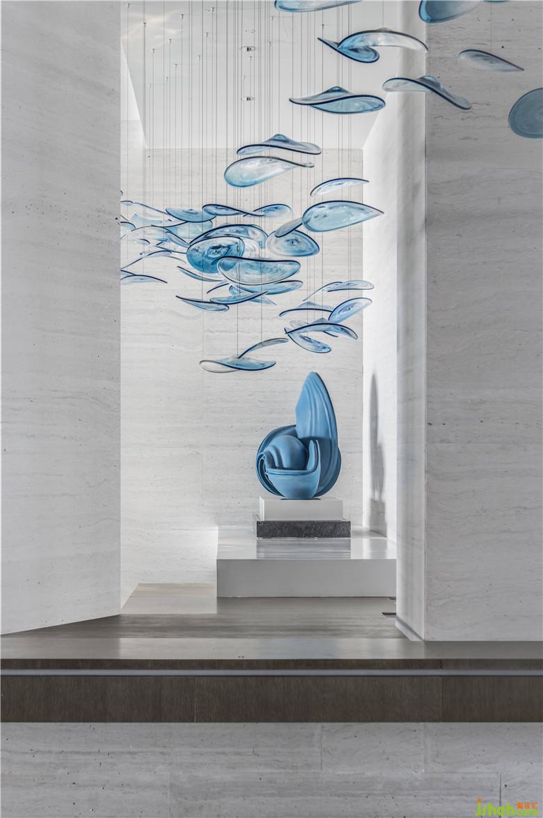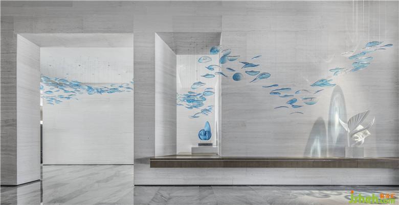 為了創(chuàng)造更流暢舒適的空間體驗(yàn),設(shè)計(jì)師特意設(shè)計(jì)了兩條動(dòng)線,在接待前廳中預(yù)留了兩個(gè)方位的門洞,促使首次/二次造訪的人群盡量不互相干擾。任意選擇一條路徑探索,都有曼妙的藝術(shù)相隨。其中右側(cè)是如海水般流動(dòng)的軟裝琉璃裝置,這正是日出東方照射著海平面時(shí)波光粼粼的情景。