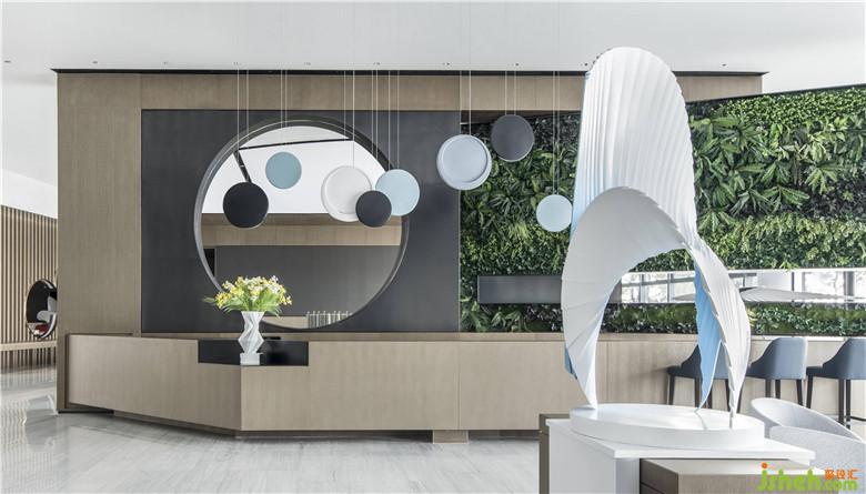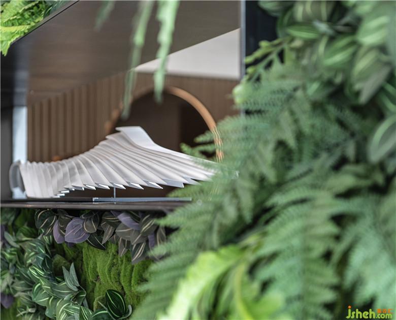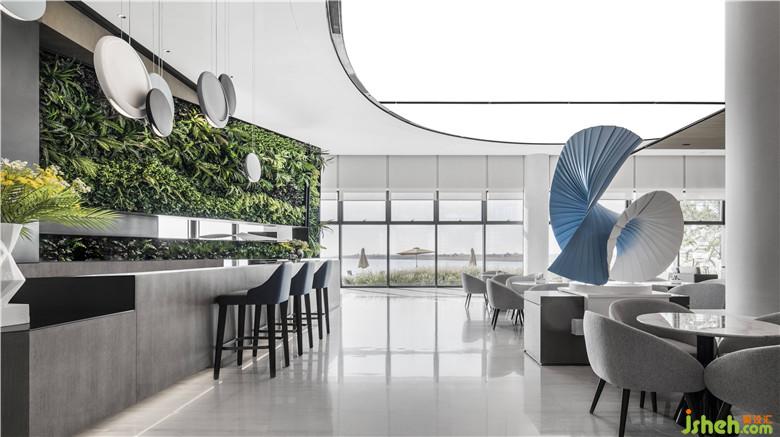 水吧區(qū)中的綠植墻欣欣向榮,對角線走勢和框景的造型不露痕跡地切割功能區(qū),打破原來空間的沉悶。從其中一個門洞延伸而來的藍色藝術吊飾,與另外的海螺型雕塑相匯合,形成了一次連續(xù)的視覺體驗。設計師借助多個藝術裝置,完成了入戶-深進的故事線設計,可謂巧妙。