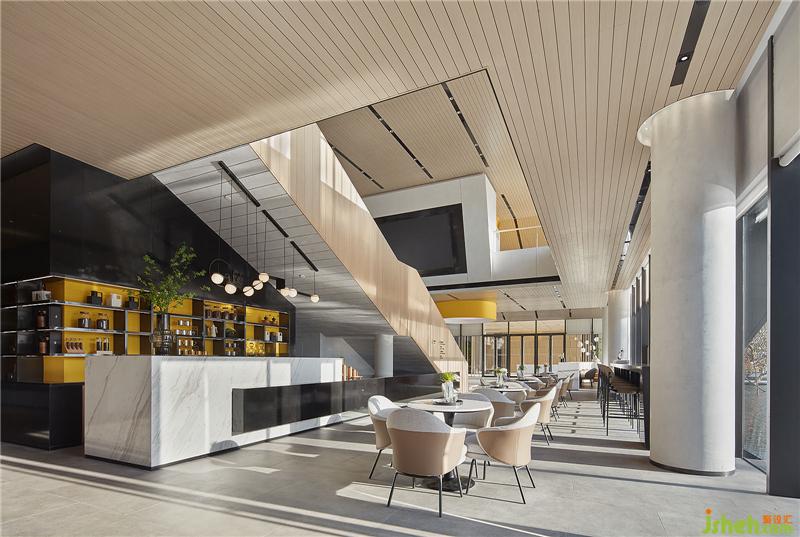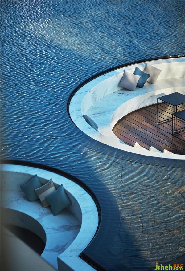 戶外的粼粼波光不再只是單調(diào)的水景。設(shè)計(jì)師采用溫潤的石材和地木,開辟出星點(diǎn)幾個(gè)、如漣漪般蕩漾開去的下沉式沙發(fā)區(qū)。不拘泥于室內(nèi),而是把社交場(chǎng)合延伸到室外以更貼近自然,創(chuàng)造豐富多元的場(chǎng)景。人與人之間、人與環(huán)境之間在開放式的空間彼此呼應(yīng)。
