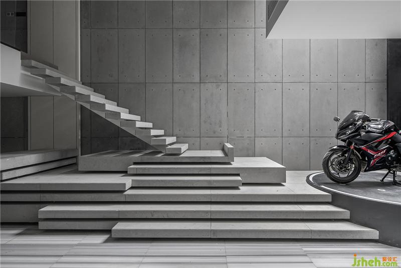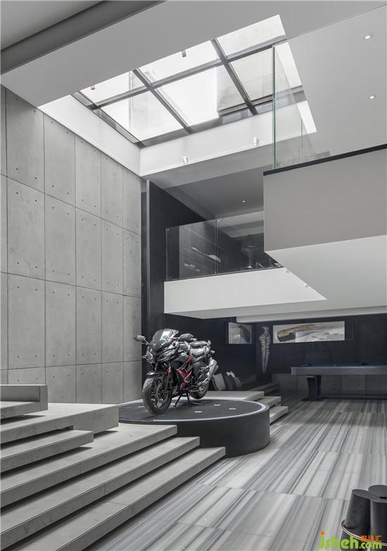 從地上一層到夾層,是專屬的健身區(qū)域,騎手造型多處隱喻居者的興趣。健身區(qū)天窗自然光照聚焦,在這里運(yùn)動,仿佛置身大自然酣暢淋漓揮灑汗水。 負(fù)一層增加樓梯通向夾層室內(nèi)空間的唯一動線,保證了空間的專屬性。設(shè)計師將原車庫位置作為室內(nèi)空間使用,增加了居者活動空間的同時兼顧了工作思考的私密性。