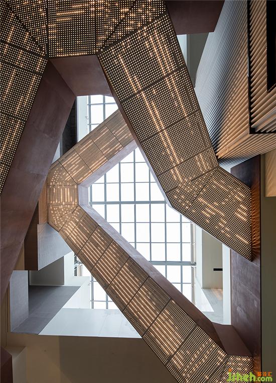 設(shè)計(jì)師本著為營(yíng)銷定制空間體驗(yàn)的出發(fā)點(diǎn),設(shè)計(jì)了主要銷售動(dòng)線和二次銷售動(dòng)線,并將洽談區(qū)以及招商洽談區(qū)分布在不同的樓層間,以增加私密感。 云梯以回旋式的結(jié)構(gòu)迂回上升,燈光透過(guò)云梯金屬板上的孔隙映射,明暗交錯(cuò)的視覺(jué)模糊,影影綽綽間可見(jiàn)現(xiàn)代解構(gòu)主義的曲線感。金屬質(zhì)感的兔子模型置于云梯下方,在金屬感中邂逅一種虛實(shí)相生的趣味性。售樓處設(shè)計(jì)