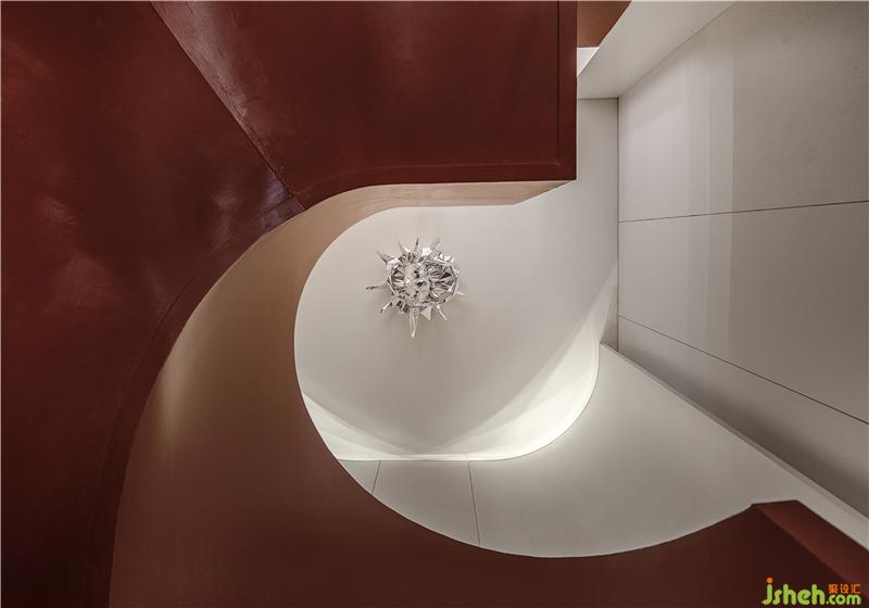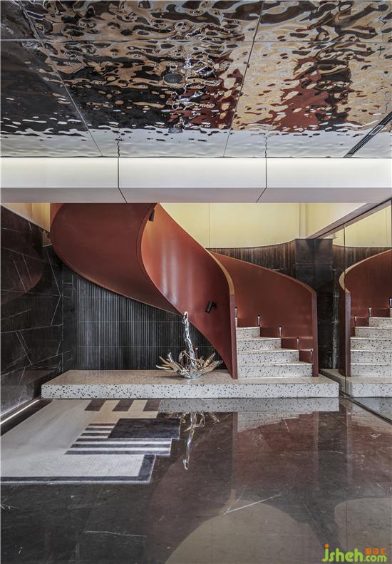 旋轉(zhuǎn)樓梯改為鋼結(jié)構(gòu)以便塑造出更為輕盈的造型。參照跳水運動員跳水的姿態(tài)而創(chuàng)作的原創(chuàng)藝術(shù)作品《上善若水》分天地兩部分,借旋轉(zhuǎn)樓梯彼此呼應(yīng),遙遙相連?!疤焖迸c“地水”的結(jié)合,平衡陰陽,包羅萬象。