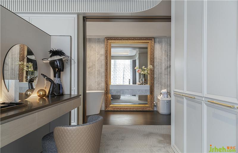 床頭背景墻是電影《布達(dá)佩斯大飯店》原型酒店的建筑外立面。電影改編自歐洲文豪茨威格的同名小說,故事展現(xiàn)該豪華酒店以及歐洲經(jīng)歷的半個世紀(jì)的歷史光陰。設(shè)計師將其連同主衛(wèi)的雕花邊框,營造優(yōu)雅高貴的復(fù)古氛圍。▼